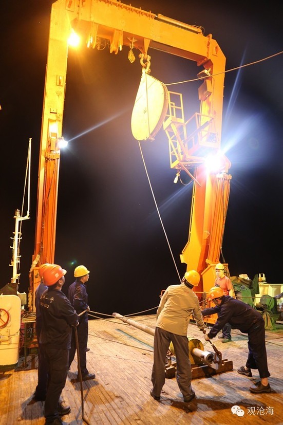23时18分,重力柱取样器露出水面??瓶级釉苯柚趾透掷碌牧α拷亓χ⊙骰厥罩梁蠹装迳?。杨刚、陈颢等迅速用缆绳将重力柱取样器固定,然后小心翼翼地取出样柱,并进行封存处理。经过测量,此次作业获取的样柱为2.60米。重力柱取样作业圆满结束。