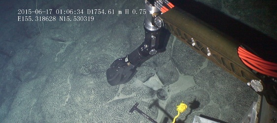 ??? 当地时间6月17日,在我国富钴结壳勘探合同区(采薇平顶山),“海马”号ROV利用机械手首次抓取了三块钴结核样品。结核样品大小相当,每块直径约为20厘米,重约6公斤,对于研究海山形成演化、结壳基岩特征和化学组分等,具有重要的科研价值。(特派记者 杨旋 通讯员 杨永)