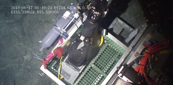 “海马”机械手抓住一块钴结核准备放入样品框中。(图片截取自“海马”拍摄的高清视频)