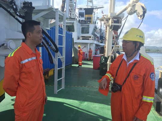 本次航段的船长孙雁鸣和首席科学家邓希光在商量沟通工作。