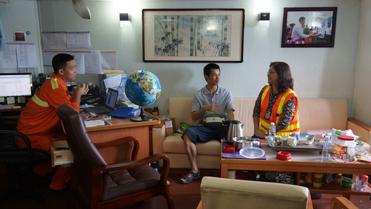 即将回国的第二航段的船长蓝明华和即将出海的第三航段船长孙雁鸣在交接工作并与关岛代理商量有关事宜。