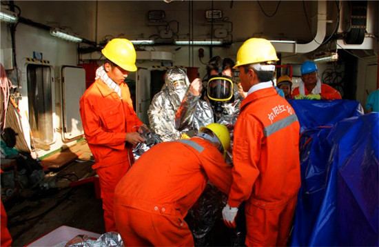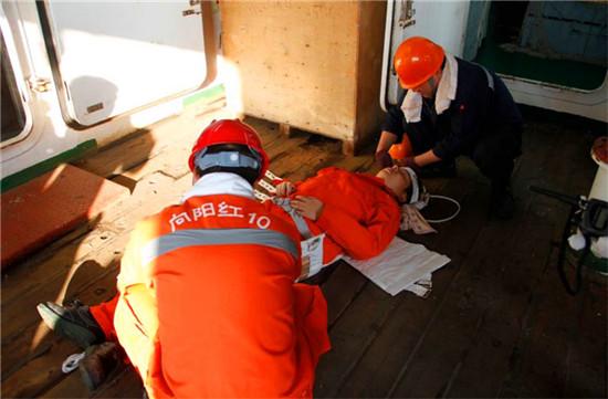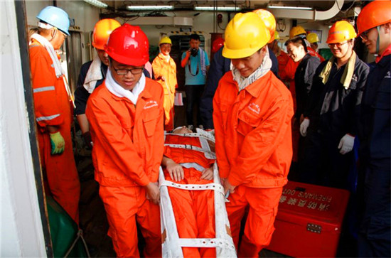 队员回到船舱后不久,乱铃加四短警报再次拉响,这一次的消防演练模拟机舱失火,有了一次演习经验的科考队员们拿着湿毛巾、戴好安全帽,鱼贯而出走到后甲板上,积极待命。船员各司其职,排除“险情”。探火员迅速进入机舱“扑灭”不大的火势?!氨ǜ媛只?,火势不大已被扑灭,未造成更大损失”,穿着消防员装备的探火员向现场指挥轮机长报告道。模拟救助伤员也同时展开,只见伤员被迅速固定在担架之上,由四名船员将其抬出,接受救援。