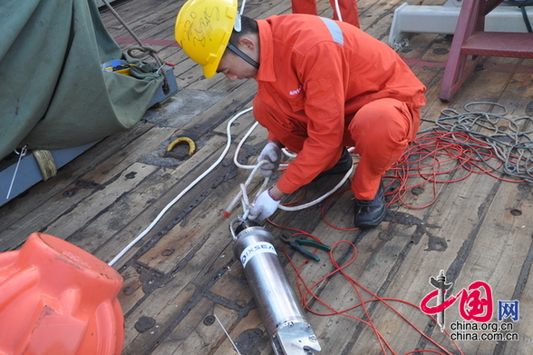 AUV组员打捞与信标相连的浮球(摄影 中国网/葛蕾)