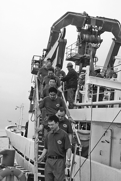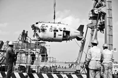 7月13日,青岛国家深?;芈胪罚樗孀培诹恋钠焉?,国家海洋局“向阳红09”科考船缓缓靠岸,此时,蜚声中外的“蛟龙号”载人潜水器正像一个大胖娃娃静静地躺在“向阳红09”船的怀中。