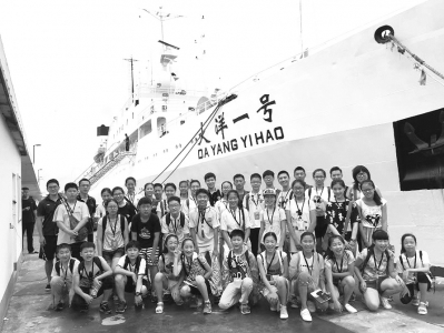 图为小记者在“大洋一号”船前合影留念。 (王晶)