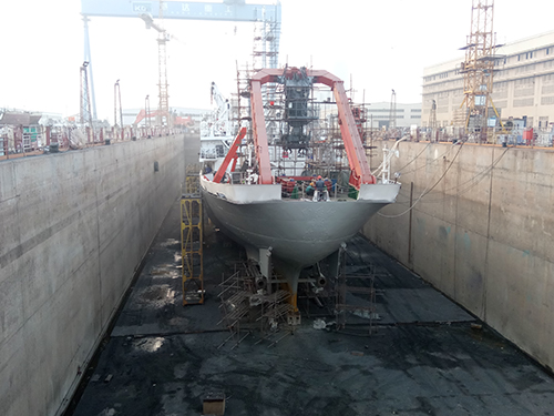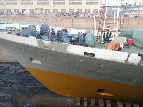 检修单上罗列项目之多让记者吃惊。常规修理项目包括特检修理、船体喷砂除锈及油漆喷涂;更换锌块及防污电极;更换部分舱室锈蚀壁板、底板和防火门;甲板机械拆检保养;油水舱除锈清洁;主、辅机大修,更换部分超标缸套,更换部分超标主机缸头;船载调查设备维护等。增改装项目包括可调桨控制系统、主机冷却器、操舵仪、雷达、11台水泵、1只橡皮艇及挂机、艇筏吊、21个主机泵控箱、水纹绞车等,另外还有很多细微的工作没有列入。