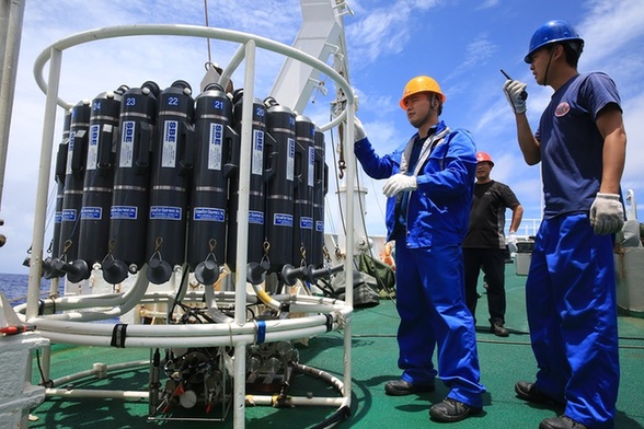 当地时间5月22日8时许,“向阳红”09船到达马里亚纳海沟作业区,随即开展CTD(温度、盐度、深度、采水)作业。当日10时,参航人员按相关作业要求将CTD设备布放入水。6小时后,设备自6000米深的海底完成采样顺利回收到甲板。航段首席科学家陈新华介绍,经初步鉴定,本次作业共采集6层共24瓶海水样品,获得6000米水深温盐变化数据,相关数据为首次下潜的配重提供重要依据。(中国海洋报 郭松峤)