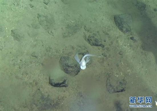 这是5月30日“蛟龙”号载人潜水器拍摄的狮子鱼在马里亚纳海沟游弋的画面。当日,“蛟龙”号载人潜水器继续在世界最深处的马里亚纳海沟下潜,最大潜深6699米,获取到岩石、沉积物、生物和近底海水样品,近距离拍摄到两条狮子鱼在深渊海底的游弋影像。(中国大洋协会供图)