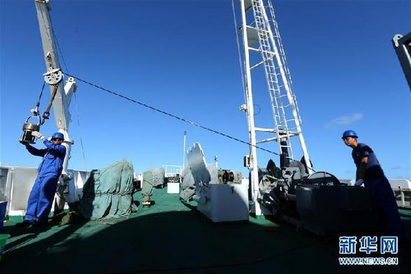 5月27日,工作人员回收6971水声电话,它与声学吊阵相互配合,互为备份,保障“蛟龙”号与母船的水声通信联系。 “蛟龙”号载人潜水器继5月23日在世界最深处的马里亚纳海沟北坡首潜后,25日和27日又分别在南坡和北坡进行了一次6000米级大深度下潜,获取了深渊生命演化和生物对深渊环境适应机制研究的大量第一手资料和样品。 27日完成的马里亚纳海沟第3潜,也是中国大洋38航次第三航段第3潜,下潜人员为唐嘉陵、赵晟娅和张维佳,最大潜深6544米,海底作业3小时07分?!膀粤焙糯哟笱笊畲Υ亓?5.4公斤玄武岩样品,16升近底海水和7管沉积物样品,以及海参、??犯?只。(摄影 刘诗平)