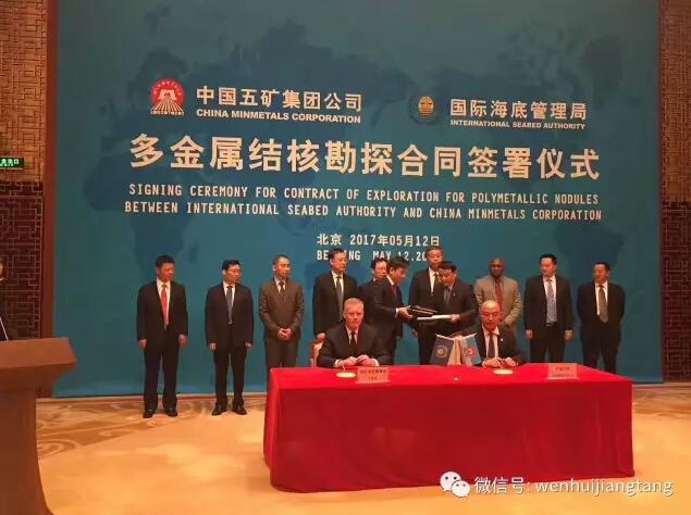 5月12日,继签署“国际海底多金属结核矿区勘探合同延期协议”后,ISA秘书长迈克·劳治和中国五矿集团又签署了多金属结核勘探合同