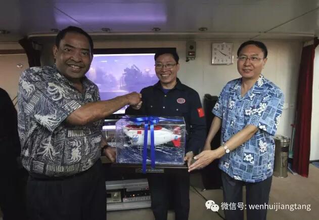 “蛟龙”号7000米海试队向密克罗尼西亚联邦副总统赠送“蛟龙”号模型