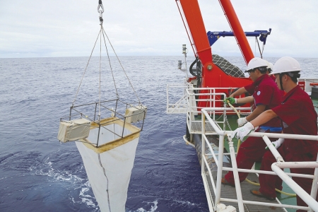 当地时间9月2日,中国大洋45航次科考队在东太平洋海域开展拖网采样作业,对海洋新兴污染物——微塑料进行监测。