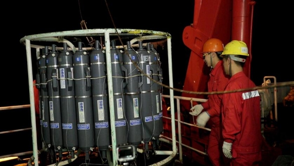 CTD是一种测量海水温度、盐度及深度的仪器,可以测定海洋不同水层、深度的海水水温、盐度等参数,并采集不同深度的水体样品,用以研究海水物理化学性质、水层结构和水团运动状况。本次作业期间,还在CTD上加挂了氧化还原电位和水体浊度探测传感器。