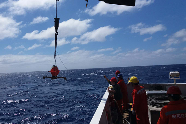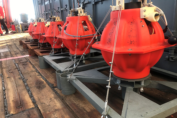 不一会儿,地震组也为我们添上一盏“花灯”——橙色的海底地震仪“OBS”高悬空中,如一盏盏灯笼摇曳海上,那是船上的队员们为祖国遥寄的祝福。