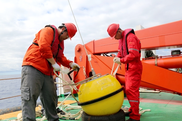 2月27日下午3时,涌浪使船左右不停摇摆。随着缆线上收,红白相间的湍流仪浮出水面?!跋蜓艉?1”船右舷的绞车架缓缓转动,悬在甲板下方的湍流仪摇摆不定。一名调查队员徐徐向上拉紧绳子,湍流仪被牢牢抓住,稳稳地回收甲板上。