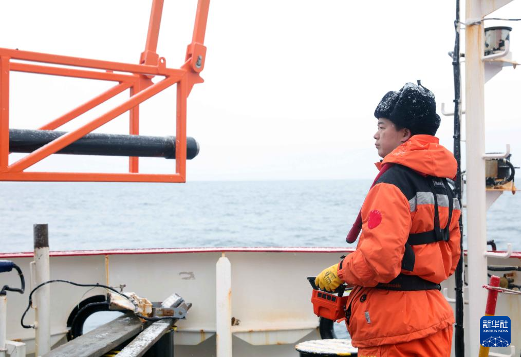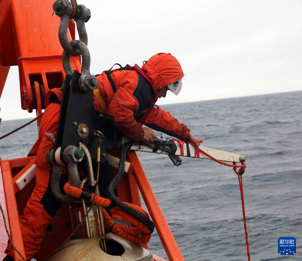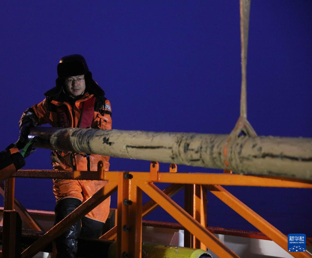 2月9日,“雪龙2”号副水手长何群在操控重力柱释放。垂直触底后,重力柱将收集海底沉积物样本以供研究。