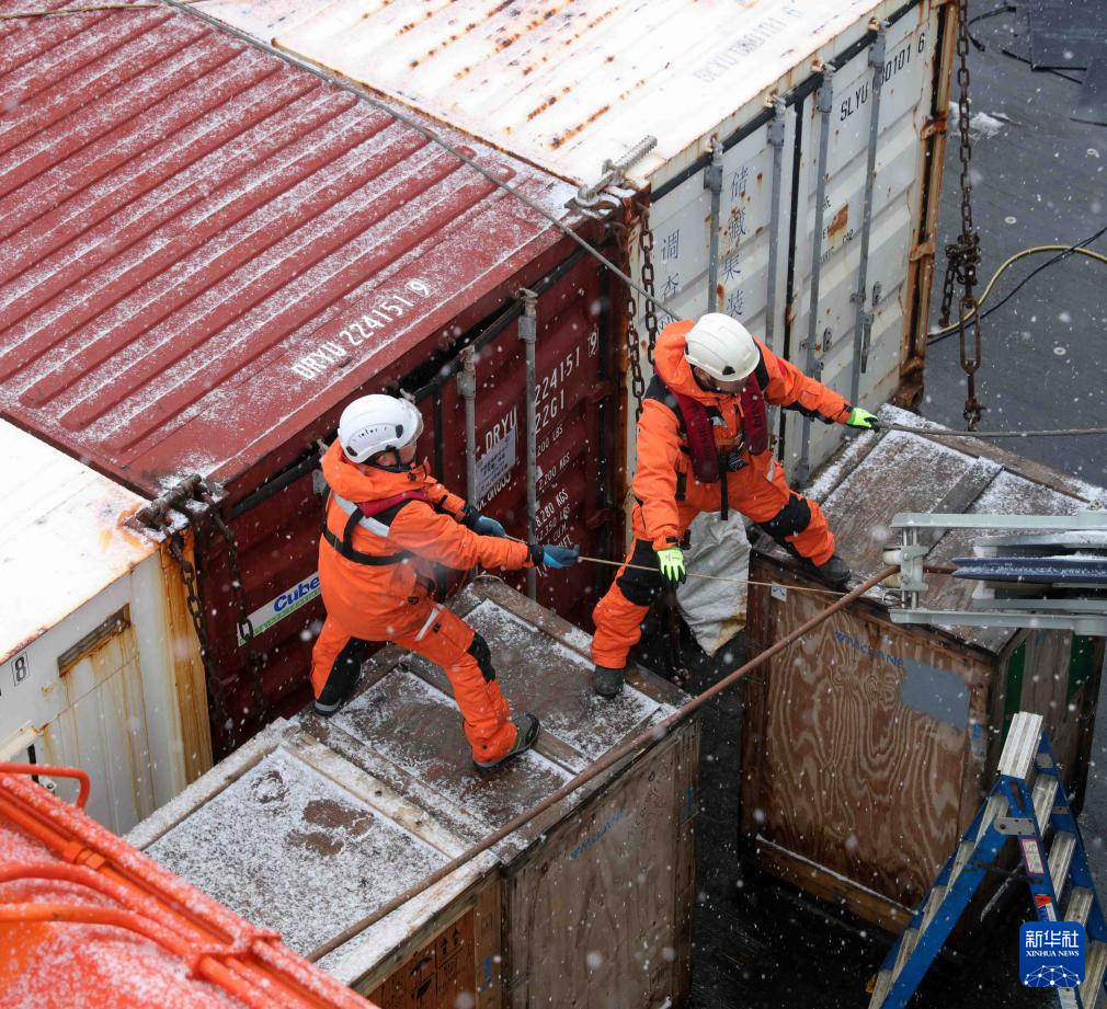 2月9日,考察队员在风雪中进行重力柱释放前的准备工作。垂直触底后,重力柱将收集海底沉积物样本以供研究。