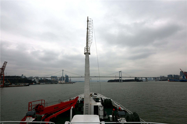 An April 15 photo shows Dayang Yihao, which carried the unmanned submersible Qianglong 3 and a research group of 70 people from Xiamen to the South China Sea. [Photo/Xinhua]